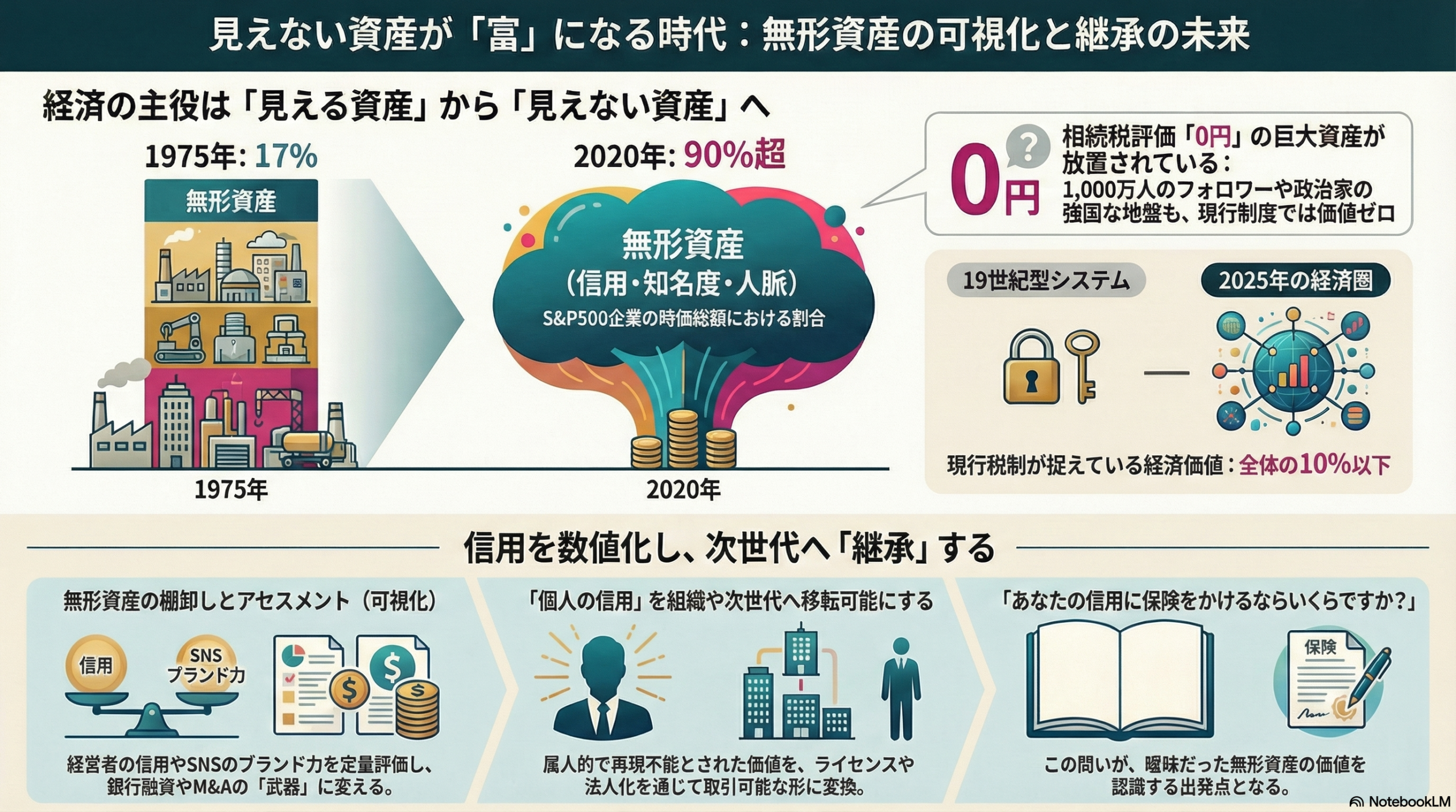 現代の法律や金融システムは、土地や現金といった「見える」物質経済を前提に設計されています。しかし、YouTuberの生み出す巨大な収益力や、3代続く政治家一族の強固な「地盤」、そして堀江貴文氏のように名前一つで市場を動かす力。これら「見えない無形資産」こそが、現代経済の真の推進力であることは疑いようがありません。