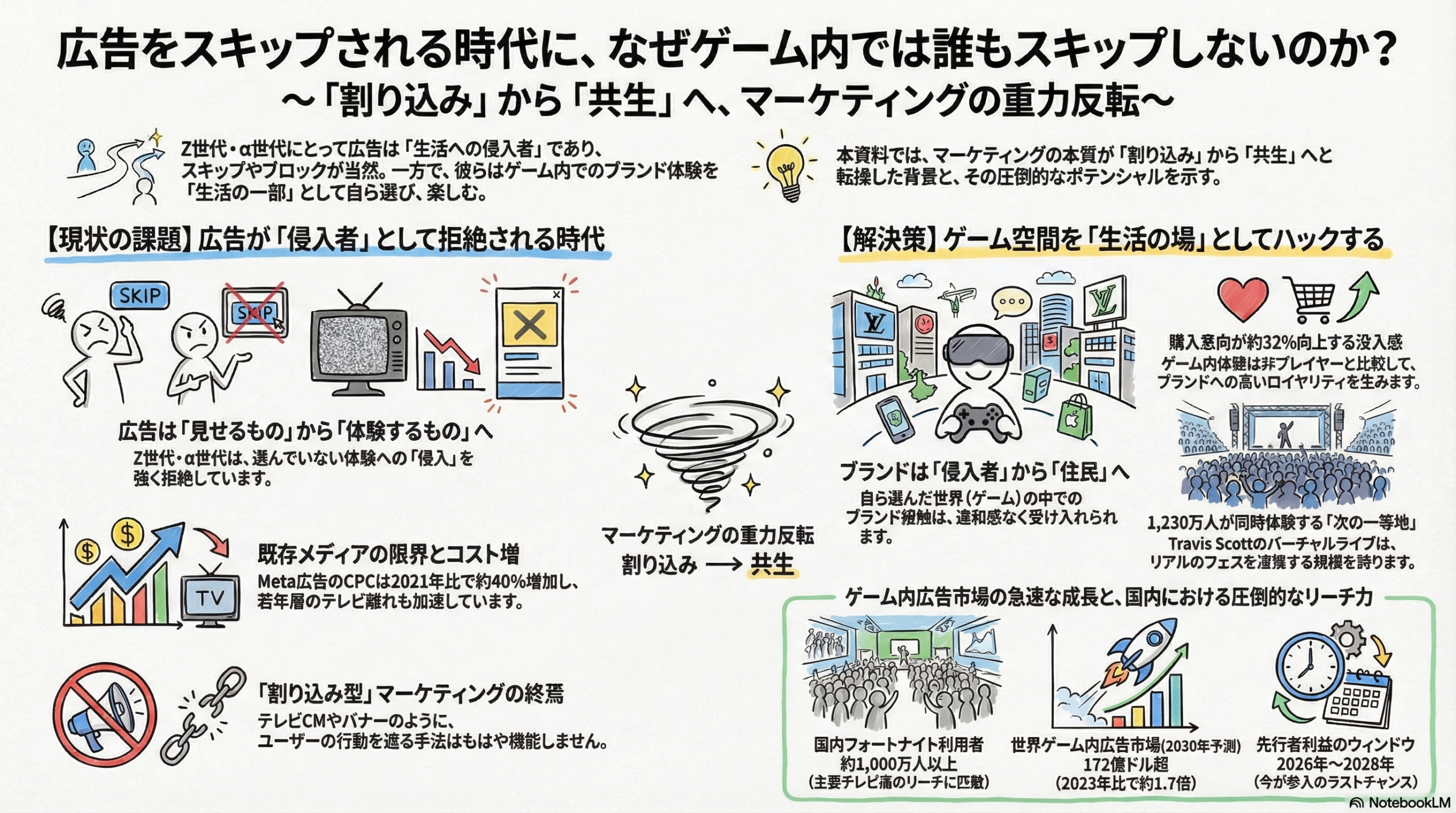「皆様が日々、心血を注いで制作している広告は、なぜZ世代・α世代に瞬時にスキップされるのでしょうか。それなのに、なぜ彼らはフォートナイトのようなゲームの世界では、何時間もブランドロゴに囲まれながら、自ら喜んで課金までして過ごしているのでしょうか?」